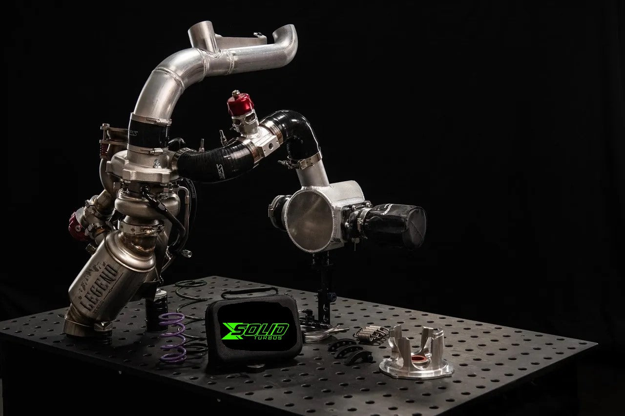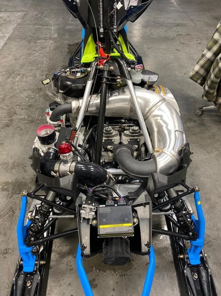 BY INCORPORATING A LOW PRESSURE BY-PASS IN THE CHARGE BOX WE ARE ALLOWING THE MOTOR TO BREATH LIKE A NATURALLY ASPIRATED MOTOR ON THE BOTTOM END. WHEN THE PRESSURE IN THE CHARGE BOX EQUALS ATMOSPHERIC PRESSURE THE BY-PASS CLOSES AND THE TURBO IS NOW SPOOLED. THE MORE AVAILABLE AIR ALLOWS YOU TO ADD MORE FUEL, THE ADDED FUEL EQUALS MORE POWER AND THE FASTER YOU CAN LOAD THE MOTOR THE FASTER YOU CAN SPOOL THE TURBO. THIS PROCESS IS COMPOUNDING AND IS EXTREMELY FAST. THIS TECHNOLOGY ISN’T NEW BUT FOR SOME REASON WAS NEVER USED. SKIDOO AND POLARIS ARE NOW USING THE SAME LOW PRESSURE “TURBO BY-PASS” REAFFIRMING THE VALIDITY OF SOLIDS DIRECTION. THE LARGE CHARGE BOX ALSO WORKS LIKE A BIG SHOCK ABSORBER WHEN CHOPPING THE THROTTLE BY REDUCING THE PRESSURE SURGE THAT CAN MAKE ITS WAY BACK TO THE TURBO.